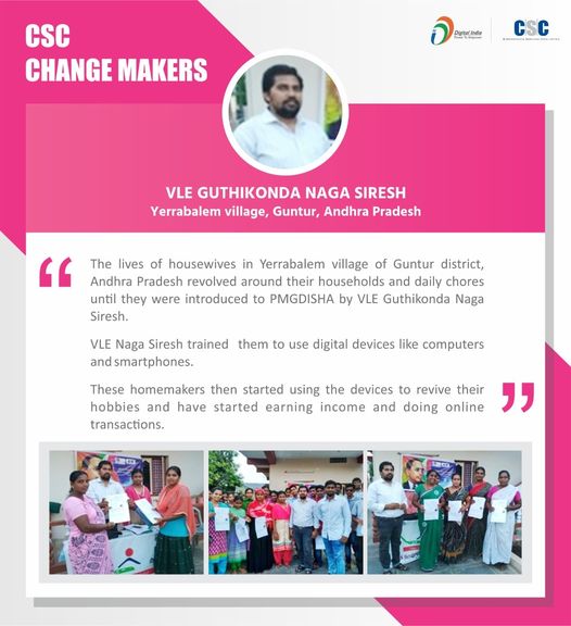 Naga Siresh. VLE Naga Siresh trained them to use digital devices like computers and smartphones.These homemakers then started using the devices to revive their hobbies and have started earning income and doing online transactions.